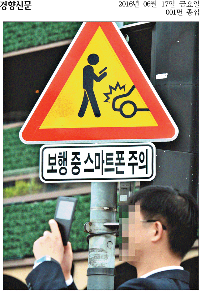 이날 경향신문과 한겨레는 스마트폰 교통안전표지판을 1면 사진에 담았다. 경향은 서울시청 주변에서 한 시민이 보행 중 스마트폰 사용을 경고하는 교통 안전표지판 아래에서 신호를 기다리며 스마트폰을 보고 있는 모습을 담아 “서울시와 경찰청은 국내 처음으로 이 같은 경고표지판과 보도부착물을 설치하고 올해 말까지 서울시내에 교통안전표지판 50개, 보도부착물 250개가 각각 설치된다”고 전했다.