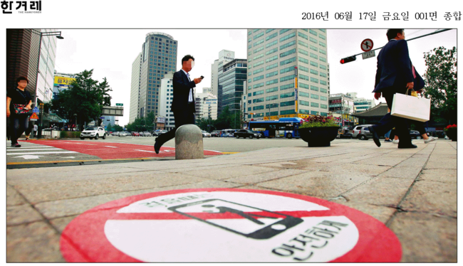 한겨레도 같은 소식을 전하며 “서울 태평로 서울광장 앞 횡당보도 주변에 설치된 보행 중 스마트폰 사용 시 주의를 당부하는 보도부착물 너머로 시민이 스마트폰을 보며 건너고 있다”며 “서울시는 10~30대 보행자 교통사고가 잦은 서울시청 앞, 연세대 앞, 홍익대 앞, 강남역, 잠실역 등 5개 지역에 스마트폰 안전 사용을 위한 교통안전표지와 보도부착물 설치 시범사업을 올 연말까지 실시한 계획”이라고 밝혔다.