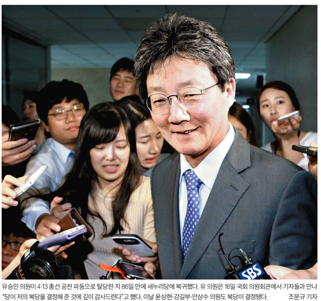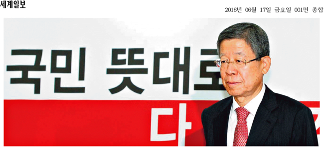 이날 세계일보와 중앙일보는 새누리당 복당 소식을 1면으로 보도했다. 새누리당 혁신비상대책위원회가 무소속 유승민, 윤상현, 강길부, 안상수 의원 등 4명의 일괄 복당을 결정해 친박근혜계 의원들이 반발하는 등 파문이 일고 있다. 세계일보는 김희옥 혁신비대위원장의 모습을 담아 “유승민 의원 등 무소속 의원들의 일괄복당을 결정했으나 친박계 의원들이 거세게 반발하자 거취를 고민하겠다는 의사를 밝혔다”고 전했다.