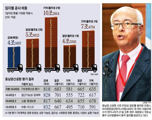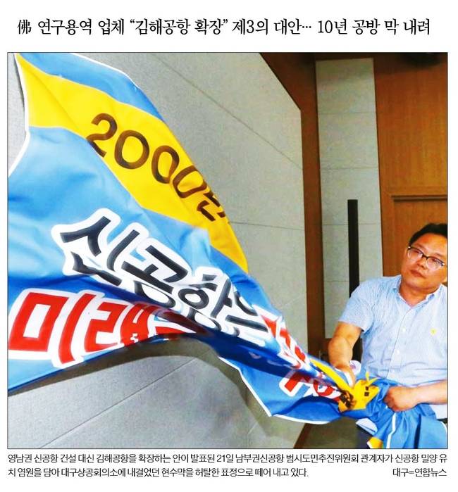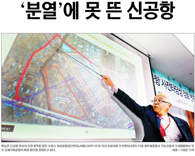 영남권 신공항 건설 계획이 21일 무산됐다. 국토교통부와 용역을 맡은 ADPi(프랑스 파리공항 공단엔지니어링)는 부산 가덕도나 경남 밀양에 신공항을 건설하는 것보다 기존 김해공항을 확장하는 게 최선이라는 결론을 내렸다. 22일 종합일간지 대부분은 관련 사진을 1면에 담고 다양한 분석을 내놨다.