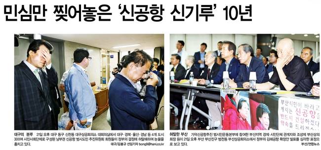 한국일보는 "사실 정부가 이번에 ‘솔로몬의 대책’으로 내놓은 김해공항 확장 방안은 전혀 새로울 것이 없다. 김해공항 확장 방안은 신공항 입지 선정 논란이 불거질 때마다 대안으로 제시됐다. 신공항 건설에 타당성이 없다는 주장을 뒷받침하는 연구 용역 결과도 꾸준히 발표됐다"며 "그러나 정부는 이런 의견을 모두 묵살한 채 정권이 바뀔 때마다 신공항 건설 담론을 재차 끄집어 냈다. 영남지역의 갈라진 민심은 이런 지적에 귀를 틀어막은 정부와 일부 지역 정치인이 영남권 신공항 건설을 밀어붙인 결과라는 지적이다"고 보도했다.
