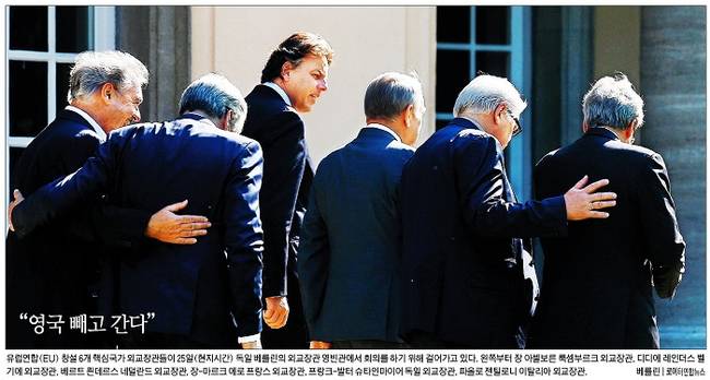 경향신문은 EU 창설 6개 핵심국가 외교장관들이 25일(현지시간) 독일 베를린의 외교장관 영빈관에서 회의를 하기 위해 걸어가고 있는 모습을 1면 사진으로 담았다. 경향신문은 “장 아셀보른 룩셈부르크 외교장관, 디디에 레인더스 벨기에 외교장관, 베르트 쾬데르스 네덜란드 외교장관, 장-마르크 에로 프랑스 외교장관, 프랑크-발터 슈타인마이어 독일 외교장관, 파울로 젠틸로니 이탈리아 외교장관이 모였다”면서 “이들 6개국은 교역을 토해 분쟁을 막고 유럽을 통합한다는 정신을 환기시키며 EU를 더 공고히 할 방안을 논의했다”고 보도했다.