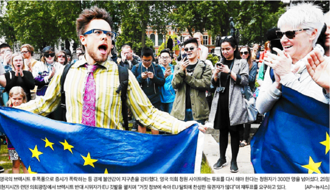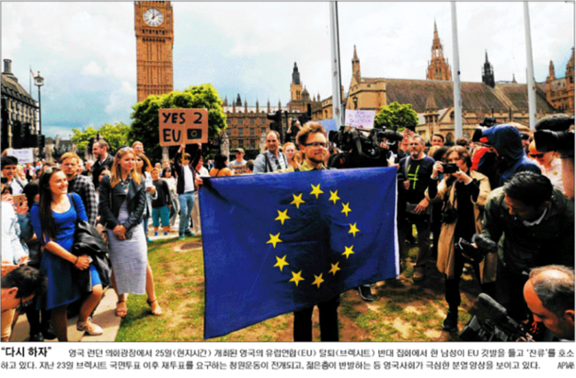 중앙일보도 브렉시트 반대 시위자가 EU 깃발을 펼치며 “거짓 정보에 속아 EU 탈퇴에 찬성한 유권자가 많다”면서 재투표를 요구하고 있는 모습을 1면 사진으로 전했다. 중앙일보는 “영국의 브렉시트 후폭풍으로 증시가 폭락하는 등 경제 불안감이 지구촌을 강타했다”면서 “영국 의회 청원 사이트에는 투표를 다시 해야 한다는 청원자가 300만 명을 넘어섰다”고 보도했다.