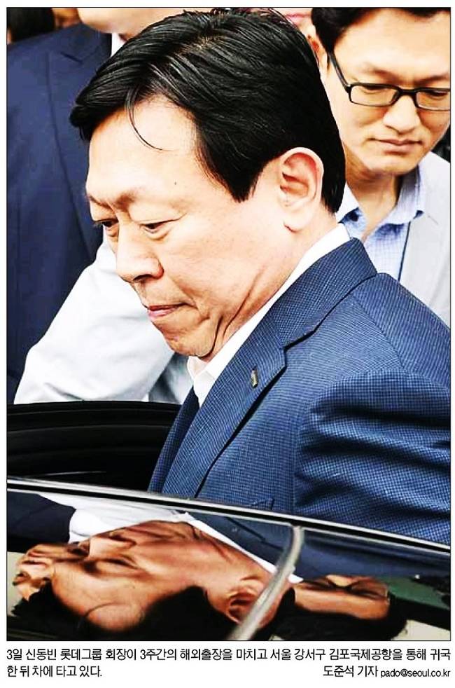 중앙일보 역시 같은 사진을 1면에 올렸다. 중앙은 관련기사에서 “검찰은 수사 초기부터 신 회장을 정면으로 겨냥했다. 검찰은 계열사 및 총수 일가에 대한 일감 몰아주기와 무리한 인수합병, 국내외 비자금 조성이 신 회장의 지시에 따라 이뤄진 것으로 의심하고 있다”고 했다. 그러면서 “롯데 측은 검찰이 롯데케미칼의 수백억원대 비자금 조성 의혹을 집중적으로 파고들자 반박자료까지 내며 맞섰다. 검찰이 일본 롯데물산에 대한 자료 제출을 요구하자 ‘일본 주주들이 반대한다’며 거절했다고 한다”고 덧붙였다. 중앙은 “신 회장이 어떻게 대응할지는 수사의 주요 변수가 될 수 있다”면서 “검찰은 신 회장을 출국금지하지는 않을 계획이다 향후 경영권 방어를 위해 일본 주주총회 등에 참석할 수 있도록 해주겠다는 것으로 풀이된다”고 전했다.