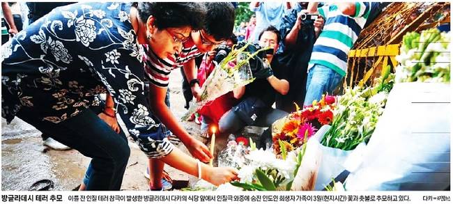 세계일보는 지난 1일 발생한 인질극 중 숨진 인도인 희생자 가족이 꽃과 촛불로 추모에 나선 모습을 대문 사진으로 선택했다. 세계는 관련기사에서 “수니파 무장단체 ‘이슬람국가(IS)’의 테러가 아시아 지역으로 확산하고 있다”면서 “3일 AP통신 등 주요 외신에 따르면 방글라데시 국적의 무장괴한 7명은 1일 오후 9시20분쯤 방글라데시 수도 다카의 재외공판 밀집지역에 있는 식당 ‘홀리 아티잔 베이커리’에서 10시간 가량 인질극을 벌여 이탈리아인 9명, 일본인 7명, 미국인 1명, 인도인 1명, 방글라데시인 2명 등 20명을 살해했다. IS는 연계매체 아마크 통신을 통해 이번 테러가 자신들의 소행이라고 주장했다”고 보도했다. 그러면서 “미국 뉴욕타임스(NYT)는 서방 당국자들의 말을 인용해 이라크, 시리아 등의 거점 도시에서 연합군의 공급으로 힘을 잃고 있는 IS가 중동을 넘어 아시아로 초점을 맞추고 있다고 분석했다”고 게재했다.