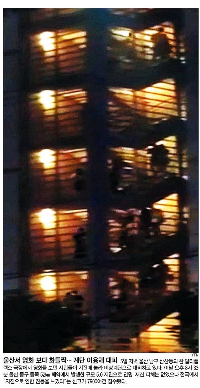 조선일보는 이날 울산의 한 멀티플렉스 극장에서 영화를 보던 시민들이 지진에 놀라 비상계단으로 대피하는 모습을 대문사진으로 선택했다. 조선은 관련기사에서 “올해 7월까지 국내에서 발생한 규모 2.0이상 지진은 총 36회로 2015년(44회)과 2014년(49회) 1년동안 일어난 지진 발생 횟수와 비교하면 빈도가 잦아지는 경향을 보이고 있다. 일각에서는 한반도가 더 이상 ‘지진의 안전지대’가 아닐 수 있다는 지적이 나오고 있다”고 게재했다.
