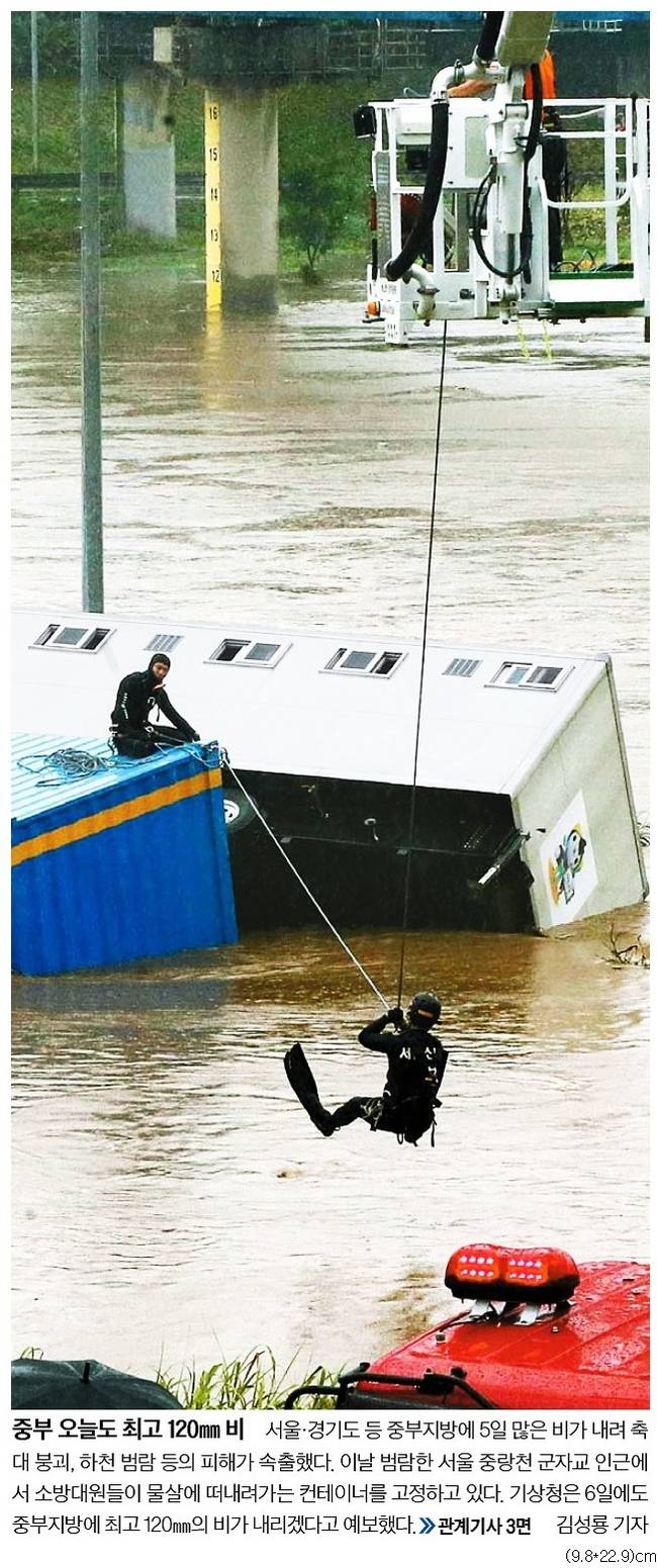 중앙일보는 서울 중랑천 군자교 인근에서 소방대원들이 물살에 떠내려가는 컨테이너를 고정하는 모습을 신문 전면에 내걸었다. 중앙은 관련기사에서 “장마전선의 영향으로 경기도 가평에 5일 하루 268mm의 폭우가 쏟아지는 등 비 피해가 잇따랐다”면서 “5일 국민안전처에 따르면 이날 폭우로 강원도에서 4명이 실종되고 126가구, 232명이 긴급 대피했다. 비닐하우스 20동을 비롯해 농경지 733ha도 침수됐다. 또 인천·김포·김해·제주 등 6개 공항에서 항공기 86편이 결항됐고 9개 항로 여객선 15척도 발이 묶였다”고 전했다. 이어 “특히 경기도 북부 전역에 호유경보가 내려진 이날 가평에서는 한때 시간당 64mm의 물폭탄이 쏟아졌다. 경기도 연천·파주 임진각 일대에서는 북한 황강댐의 무단 방류 가능성이 커지면서 하루 종일 팽팽한 긴장감이 흘렀다”고 게재했다.