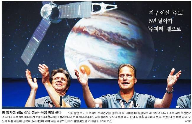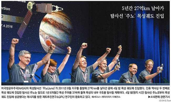 동아일보는 탐사선 주노로부터 목성 궤도 진입에 성공했다는 메시지를 받은 후 제트추진연구소 연구진들이 환호하는 모습을 1면 사진으로 선택했다. 동아는 관련기사에서 “주노는 제작과 발사에 1조원이 넘게 투입된 초대형 사업이다. 2011년 8월 발사돼 장장 27억km를 날아가 목성에 도착했다. 목성까지 거리가 워낙 멀어 주노는 2013년 지구의 중력도움(스윙바이)을 받아 목성까지 날아갈 수 있었다”고 보도했다.