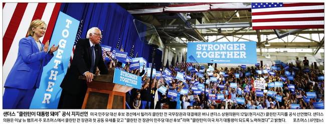 경향신문, 한겨레는 13일자 1면 사진기사로 미국 민주당 대선 후보 경선에서 힐러리 클린턴 전 국무장관과 대결해온 버니 샌더스 상원의원이 12일(현지시간) 클린턴 지지를 공식 선언하는 모습을 실었다.