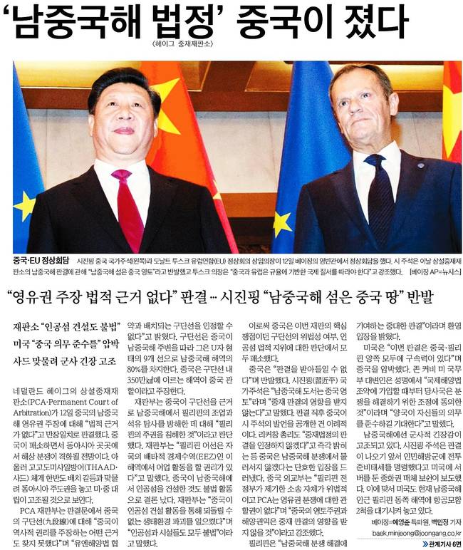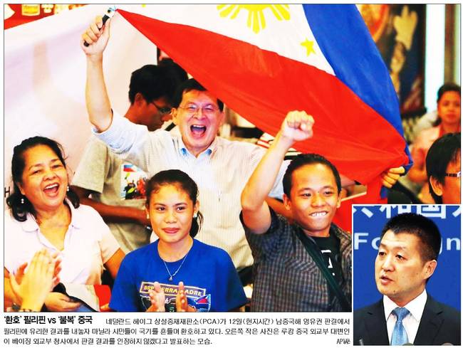 동아일보도 네덜란드 헤이그 상설중재재판소(PAC)가 12일 중국의 남중국해 영유권 주장 근거를 부인하고 중국의 인공섬 건설이 필리핀의 주권을 침해한 것이라고 판결하자 필리핀 수도 마닐라 시민들이 국기를 흔들며 환호하고 있는 모습을 전했다.