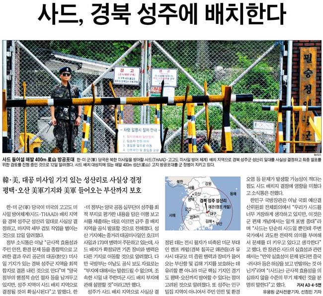 조선일보는 한.미 군 당국은 북한 미사일을 방어할 사드(THAAD.고고도 미사일 방어 체계) 배치 지역으로 경북 성주군 성산리 일대를 사실상 결정하고 최종 발표를 위한 검토를 진행 중인 것으로 알려졌다며 사드 배치 대상지에 있는 해발 400m 성산 고지 방공포대를 군 장병이 지키는 모습을 실었다.