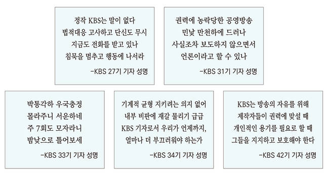 KBS 기자들은 지난 5일 27기를 시작으로 29·30·31·33·34·35·38·42기가 잇따라 연명 성명을 게시하며 “입을 다문” 자사 보도를 지적하고 나섰다. 주니어부터 시니어 기자까지, 이들의 불만은 극에 달해 있다.
