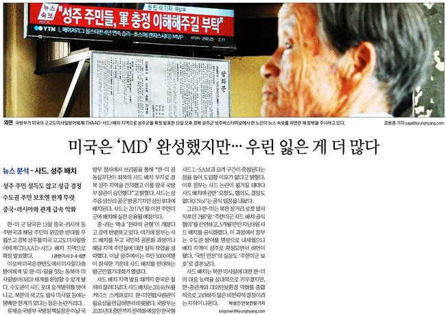 경향신문은 14일자 1면 사진 기사로 국방부가 미국 고고도미사일방어체계(THAAD·사드) 배치지역으로 경북 성주군을 확정 발표한 13일 오후 경북 성주군 성주버스터미널에서 한 노인이 뉴스 속보를 외면한 채 창밖을 주시하고 있는 장면을 실었다.