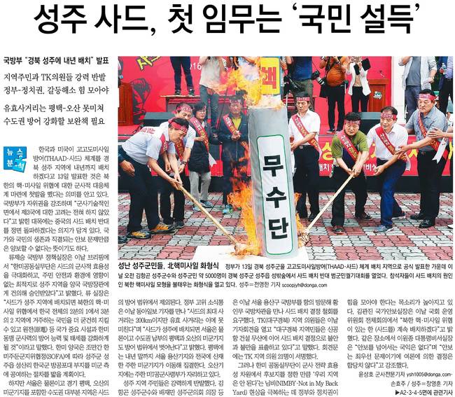 동아일보는 "한국과 미국이 고고도미사일방어 체계를 경북 성주 지역에 내년까지 배치하겠다고 13일 발표한 것은 북한의 핵·미사일 위협에 대한 군사적 대응체계 마련에 첫발을 뗐다는 의미를 안고 있다"고 분석했다.