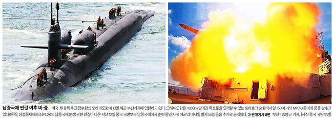 중앙일보는 미국 최대 핵 추진 잠수함인 오하이오함이 13일 해군 부산기지에 입항하고 있는 모습과 상설중재재판소(PCA)의 남중국해 분쟁 관련 판결이 나온 지난 12일 중국 국방부는 남중국해에서 훈련 중인 자국 해군의 미사일 발사 모습 등을 추가로 공개한 장면을 함께 실었다.
