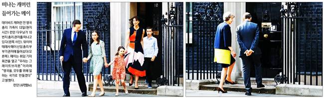경향신문은 15일자 1면 사진기사로 데이비드 캐머린 전 영국 총리 가족이 13일(현지시간) 런던 다우닝가 10번지 총리 관저를 떠나는 장면과 뒤이어 테레사 메이 신임 총리 부부가 관저에 들어서는 모습을 담았다.
