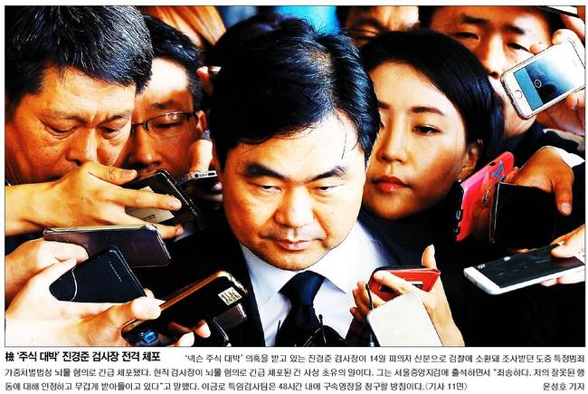 국민일보는 '넥슨 주식 대박'의혹을 받고 있는 진경준 검사장이 14일 피의자 신분으로 검찰에 소환돼 조사받던 도중 특정범죄가중처벌법상 뇌물 혐의로 긴급 체포됐다.