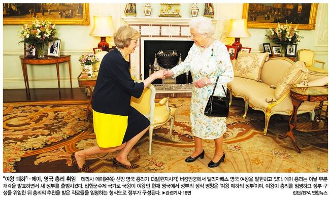 한겨레는 테리사 메이 신임 영국 총리가 13일(현지시간) 버킹엄궁에서 엘리자베스 영국 여왕을 알현하고 있는 장면을 담았다.