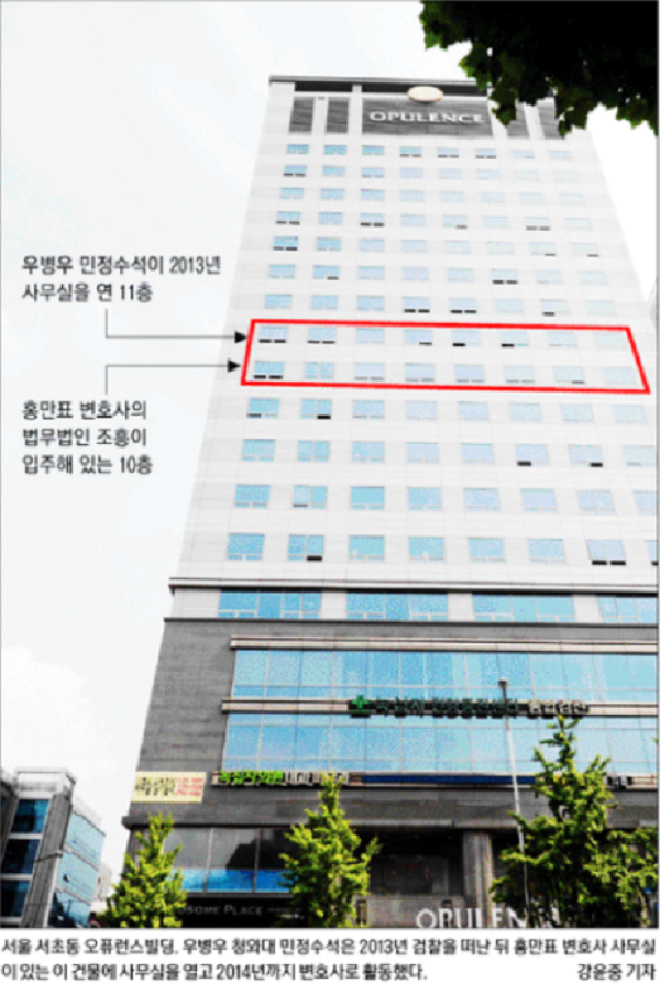 경향신문은 서울 서초동에 위치한 오퓨런스빌딩의 모습을 1면 사진으로 전했다. 경향신문은 “우 수석이 2013년 검찰을 떠난 뒤 홍만표 변호사 사무실이 있는 이 건물에 사무실을 열고 2014년까지 변호사로 활동했다”며 “그는 개업 1년 동안 홍 변호사와 함께 여러 사건을 맡았으며 정 전 대표도 이들의 고객 중 한 사람이었다”고 보도했다.