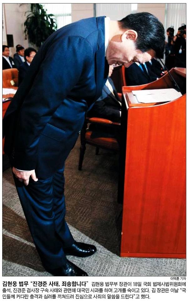 조선일보는 김 장관이 법제사법위원회에 출석, 진 검사장 구속 사태와 관련해 대국민 사과를 하며 고개를 숙이고 있는 모습을 1면 사진으로 전했다. 조선일보는 “2011년 넥슨코리아가 우 수석 처가의 서울 강남역 부동산을 1326억원에 매입할 당시 모(母)회사인 넥슨재팬이 담보를 제공해 일본 미쓰이스미토모은행으로부터 돈을 빌려 해당 부동산의 값을 치른 것으로 확인됐다”며 “넥슨은 일본 은행으로부터 대출받은 지 9개월 만에 이 부동산을 매각했는데 취득·등록세 등을 비롯한 제반 비용까지 합치면 18억~30억원을 손해 본 것으로 집계됐다”고 보도했다.