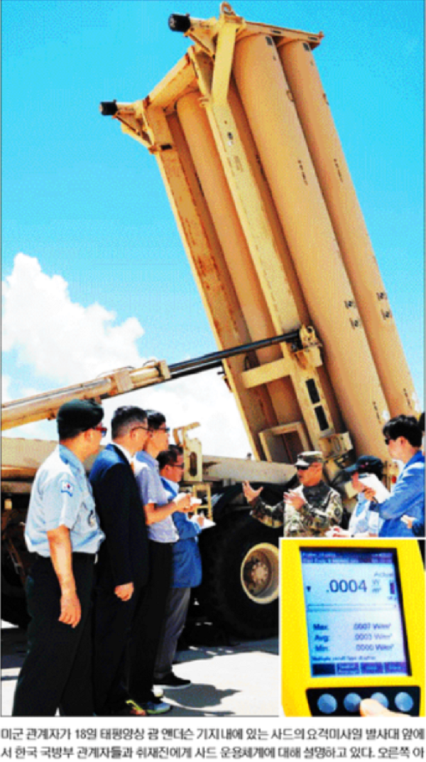 국민일보는 미군 관계자가 사드의 요격미사일 발사대 앞에서 한국 국방부 관계자들과 취재진에게 사드 운용체계에 대해 설명하고 있는 모습과 사드 레이더 전자파가 0.0004W/㎡로 찍힌 광대역 전자파 측정기의 모습을 1면 사진으로 전했다. 국민일보는 “0.0007W/㎡는 국내 전파법상 인체노출허용 기준인 10W/㎡의 0.007%에 불과한 수치”라며 “평균 전자파 세기는 0.0003W/㎡로 이보다 훨씬 더 낮았다”고 보도했다.
