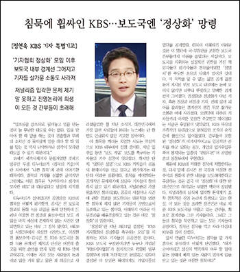 KBS가 최근 기자협회보 기고를 통해 ‘이정현 녹취록’ 보도에 침묵하는 자사 보도국을 비판한 정연욱 기자를 돌연 제주도로 발령냈다. KBS 기자들은 이를 명백한 ‘보복성 인사발령’으로 규정하며 비판성명과 항의 피켓시위 등을 이어가고 있다.