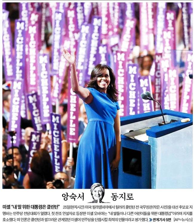 중앙일보는 미셸 오바마가 전당대회 연단에 등장해 손을 흔들고 있는 모습을 1면 사진으로 전했다. 중앙일보는 “미셸이 ‘클린턴으로 인해 내 딸들이, 우리 모두의 아들과 딸들이 여성도 미국 대통령이 될 수 있음을 당연하게 여기게 됐다’고 말했다”면서 “워싱턴포스트(WP)는 ‘완벽한 홈런’이라며 ‘전당대회의 남은 3일간 미셸보다 더 나은 연설을 찾기 어려울 것’이라고 평가했다”고 보도했다.