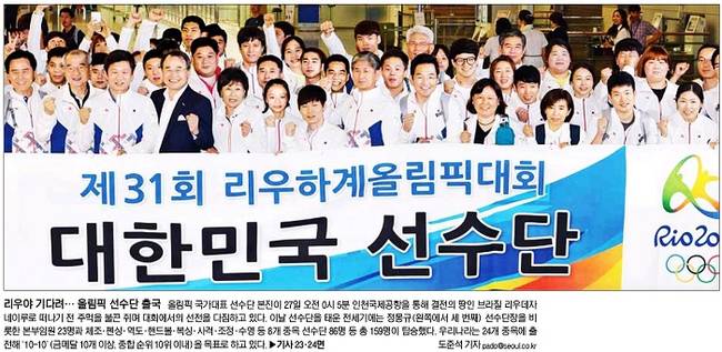 올림픽 국가대표 선수단 본진이 올림픽 대회 출전을 위해 리우행 비행기에 몸을 실었다. 서울신문은 선수단 본진이 27일 오전 0시5분 인천국제공항을 통해 결전의 땅인 브라질 리우데자네이루로 떠나기 전 주먹을 불끈 쥐며 대회에서의 선전을 다짐하고 있는 모습을 1면 사진으로 실었다.