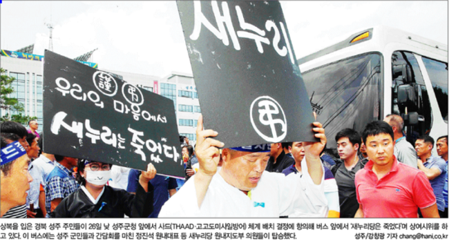 경북 성주 주민들의 항의 모습을 주목한 신문도 있었다. 한겨레는 상복을 입은 성주 주민들이 26일 낮 성주군청 앞에서 사드(THAAD·고고도미사일방어 체계) 배치 결정에 항의해 버스 앞에서 ‘새누리당은 죽었다’며 상여시위를 하고 있는 모습을 1면 사진으로 전했다.