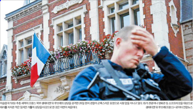 이슬람국가(IS) 추종 세력으로 추정되는 괴한 2명이 26일(현지시간) 프랑스 북부의 성당을 침입해 신부 한 명을 살해하는 사건이 발생했다. 한국일보는 이날 현지 경찰이 곤혹스러운 표정으로 시청 앞을 지나고 있는 모습을 1면 사진으로 전했다. 한국일보는 “IS가 관광지나 영화관 등 소프트타깃을 대상으로 테러를 저지른 적은 있지만 가톨릭 성당을 타깃으로 한 것은 이번이 처음”이라면서 “마누엘 발스 프랑스 총리는 ‘가톨릭 전체에 대한 공격’이라고 말했다”고 보도했다.