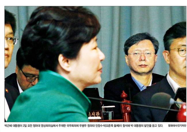 박근혜 대통령이 2일 청와대에서 국무회의를 주재하면서 고고도미사일방어체계(THAAD·사드) 배치에 대한 확고한 입장을 밝혔다. 이날 회의에는 각종 의혹에 휩싸인 우병우 청와대 민정수석도 참석했는데, 3일 조선일보와 한겨레, 한국일보는 이 모습을 1면 사진에 담았다.