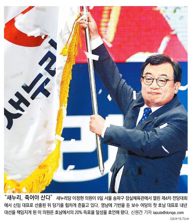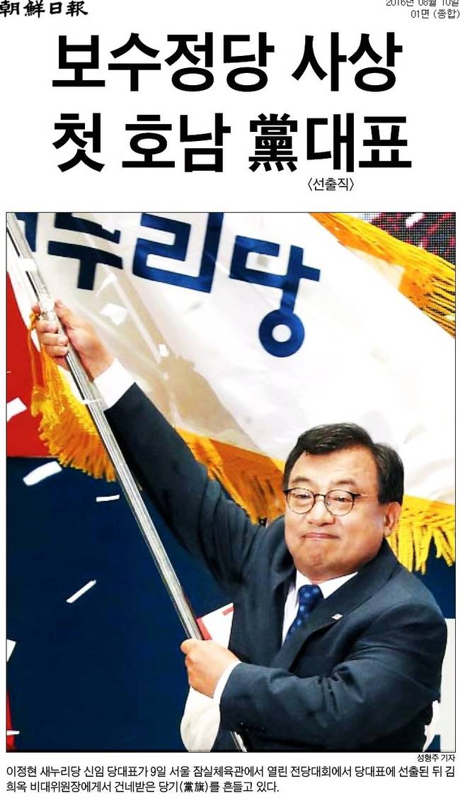 영남을 주요지지 기반으로 한 보수 여당이 내년 대선을 앞두고 첫 호남 대표를 선택했다. 9일 서울 잠실체육관에서 열린 새누리당 전당대회에서 이정현 의원은 주호영 의원을 비교적 큰 표 차로 이겼다. 이 의원은 대표적인 친박 인사다.