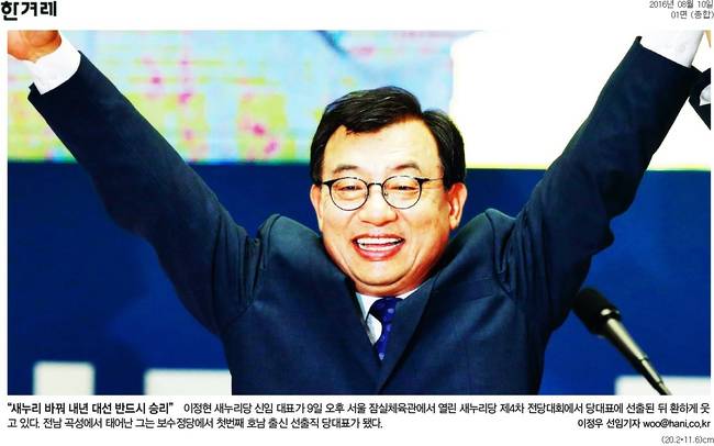 10일 동아일보와 서울신문, 세계일보, 조선일보, 중앙일보, 한겨레 등 대다수 조간신문은 전날 있었던 이 의원의 새누리당 대표 발탁 소식을 1면에 담았다. 동아는 “새누리당의 뿌리인 민주자유당이 1990년 창당된 이후 호남 출신이 당 대표로 선출된 것은 처음”이라며 “전남 순천에서 연거푸 국회의원에 당선된 이 신임 대표는 한국 정치의 철옹성으로 여겨진 지역주의 벽을 넘은 데 이어 당의 아웃사이더에서 메인스트림으로 우뚝 올라서는 기염을 토했다”고 전했다.