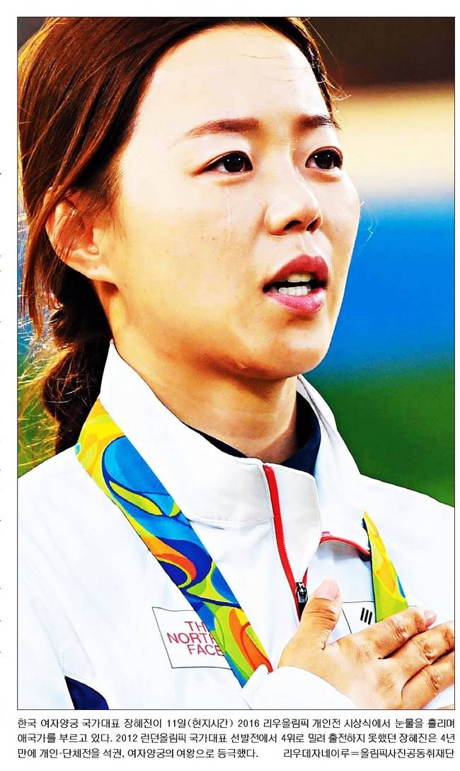 동아일보는 “여자 양궁 국가대표팀의 주장 장혜진이 늦었지만 가장 큰 꽃을 피웠다”며 “그간 장혜진은 2012년 런던 올림픽에 나갈 여자 대표팀 3명을 뽑는 선발전에서 4등을 해 올림픽 출전의 꿈을 이루지 못했다”고 밝혔다.