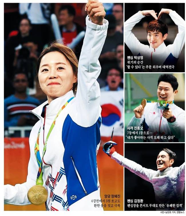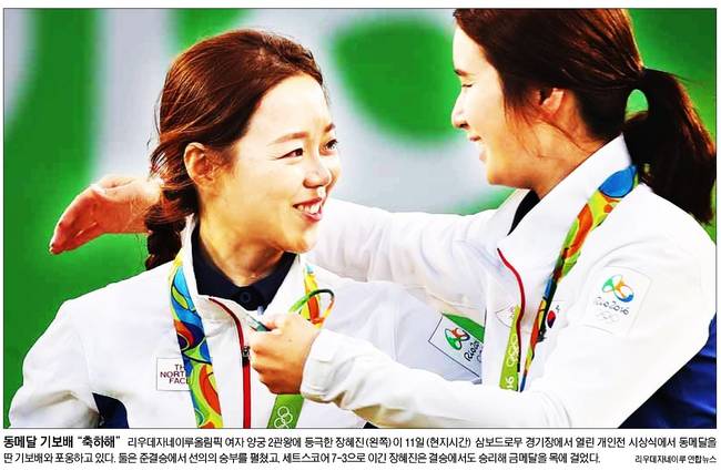 조선일보는 ‘절망을 모르는 뉴올림피언’이라는 제목의 기사를 통해 장혜진과 박상영 등 신세대의 긍정의 힘을 1면으로 보도했다. 조선은 “사람들이 포기를 생각할 때 누군가는 희망을 찾았다. 리우올림픽을 통해 우리 사회는 달라진 스포츠맨, 새로운 한국인을 목격하고 있다”며 “최악의 상황에서도 웃으며 목표를 향해 전진하고 결국 이를 달성하는 올림피언들의 모습”이라고 소개했다.