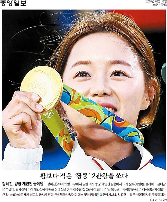 한국 여자양궁 국가대표 장혜진이 독일 리사 운루흐를 물리치고 금메달을 목에 걸었다. 13일 국민일보와 동아일보, 서울신문, 세계일보, 조선일보, 중앙일보 등 대다수 조간신문은 장 선수의 우승 소식을 1면 사진으로 보도했다.