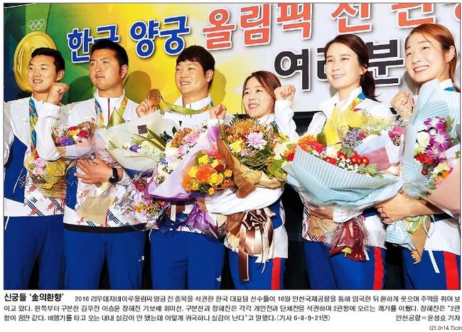 국민일보는 올림픽 양궁 전 종목을 석권한 한국 대표팀 선수들이 16일 인천국제공항을 통해 입국한 뒤 환하게 웃는 모습을 1면에 담았다. 국민은 관련기사에서 “11일 오후(현지시간) 브라질 리우데자네이루의 삼보드로무 경기장에서 열린 두 사람(장혜진, 기보배)의 2016 리우올림픽 양궁 여자 개인 전 준 결승전은 달라진 코리안 올림피언의 진면목을 보여준 대표적 장면이었다”며 “이제는 즐기는 자의 시대”라고 전했다. 앞서 장혜진은 1세트 두 번째 화살이 갑자기 분 초속 6m 강풍 때문에 3점 과녁에 꽂히자 “빙긋 웃었”던 바 있다. 국민은 또 다른 관련기사에서 “15일 브라질 리우데자네이루 올림픽 아레나에서 열린 2016리우올림픽 체조 남자 도마에서 북한이 자랑하는 ‘체조영웅’ 이세광이 금메달을 목에 걸었다”고 전했다.