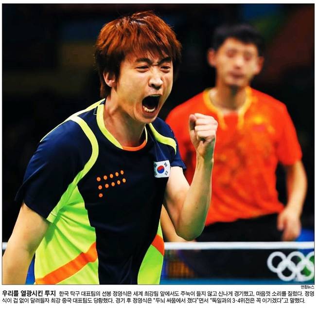 조선일보는 한국 탁구 대표팀의 선봉 정영식이 세계 최강 중국과의 일전에서 활약하는 모습을 1면에 담았다. 조선은 관련기사에서 “올림픽 탁구 종목은 중국의 전유물이 된 지 오래다. 1988년부터 올림픽 정식 종목으로 채택된 탁구에서 나온 금메달 30개 중 26개를 중국이 가져갔다”며 “리우 센트루3 경기장에서 열린 한국과 중국의 남자 탁구 단체전 준결승전, 천하의 중국이 오랜만에 긴장했다”고 전했다. 조선은 “비록 정영식은 세트스코어 2대3으로 분배했고, 한국도 단체전에서 3패를 당하며 3~4위 전으로 밀려났지만 팬들은 오랜만에 중국 만리장성에 도전한 정영식에서 열광했다”고 보도했다.