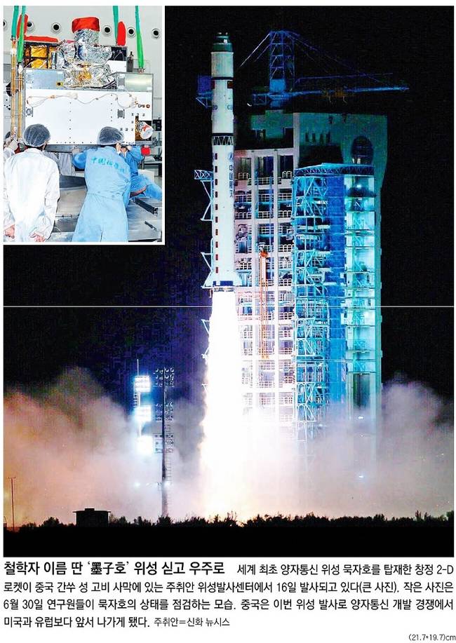 한편 동아일보는 중국이 세계 최초로 ‘양자 통신 위성’ 발사에 성공하는 16일 주취안 위성발사센터의 모습을 1면에 담았다. 동아는 관련기사에서 “양자통신은 광자너 전자 같은 양자의 특성을 이용해 보안을 획기적으로 높인 것으로 도청이나 감청이 불가능한 것으로 알려졌다. 중국이 양자위성 분야에서 미국과 유럽보다 앞서나가면서 도·감청 방지 핵심 통신기술을 갖게 됐다”고 전했다.