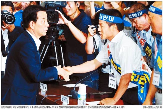 한국일보는 한민구 국방부 장관이 17일 오후 경북 성주군청에서 사드 배치 철회 투쟁위원회와 간담회를 갖기 앞서 정영길 공동위원장과 악수를 하는 모습을 1면에 담았다. 한국은 관련기사에서 “한민구 국방부 장관은 17일 고고도미사일방어체계 배치에 대한 제3후보지와 관련, ‘지역의견으로 말씀을 주시면 검토하겠다’고 밝혔다”고 전했다.