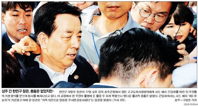 한겨레신문과 국민일보도 사드 배치와 관련해 성주를 찾은 한민구 국방부 장관의 모습을 신문 전면에 내걸었다. 한겨레와 국민일보는 모두 한 장관이 간담회를 마친 후 국무총리실 경호원, 경찰, 투쟁위 관계자들에게 둘러쌓인 채 항의를 받으며 청사를 빠져나오는 모습을 1면 사진으로 선택했다.