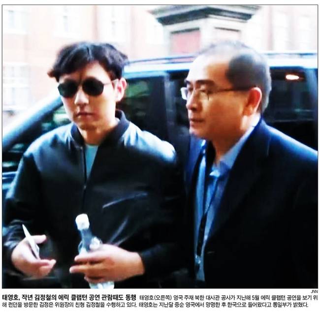 조선일보와 서울신문은 모두 태영호 공사가 지난해 5월 에릭 클랩턴 공연을 관람하기 위해 런던을 방문한 김정은 위원장의 친형 김정철을 수행하는 모습을 신문 1면 사진으로 선택했다.