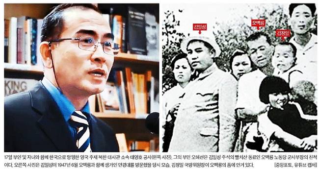 중앙일보는 태영호 공사의 사진과 그의 부인 오혜선의 친척 오백룡(김일성 주석의 빨치산 동료)과 김일성이 1947년 만경대를 방문했을 당시의 사진을 나란히 배치했다. 중앙은 관련기사에서 “태영호 공사의 부인은 오혜선(50)으로, 북한군 총참모부 오금철(69) 부총참모장의 일가라고 대북소식통이 전했다. 오금철 일가는 북한에서 최고 특권층에 속하는 ‘항일 빨치산’ 사문이다. 오금철은 김일성의 빨치산 동료이자 노동당 군사부장을 지낸 오백룡(1984년 사망)의 아들이다. 빨치산 가문이 탈북해 입국한 것은 이번이 처음이라고 정부 당국자는 말했다”고 게재했다. 중앙은 또 다른 관련기사에서 “박 대통령이 지난 15일 광복절 경축사에서 이례적으로 북한 당국의 간부와 주민을 한 데 묶어 ‘통일은 여러분 모두에게 차별 없는 기회를 줄 것’이라고 말한 것도 이런 상황과 무관치 않다고 한다”고 보도했다.