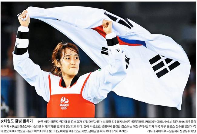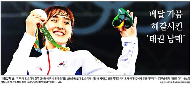 한국 여자 태권도 국가대표 김소희 선수가 17일(현지시간) 리우올림픽 여자 49kg급 결승전에서 승리해 금메달을 획득했다. 19일 경향신문, 국민일보, 동아일보, 서울신문, 세계일보, 중앙일보는 금메달과 태극기를 든 김소희의 모습을 1면에 실었다.