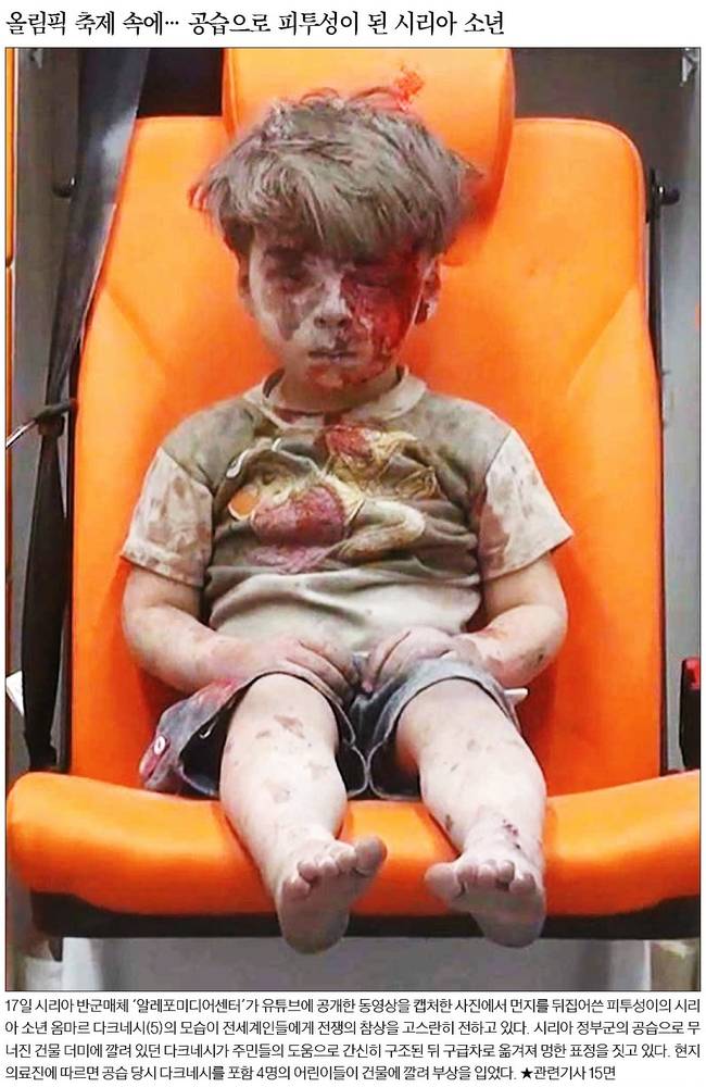 한국일보는 시리아 정부군의 공습으로 무너진 건물 더미에 깔렸던 다섯살 소년이 구조된 뒤 멍한 표정을 짓고 있는 사진을 1면에 실었다. 한국일보는 "시리아 반군매체가 공개한 동영상을 캡처한 사진에서 먼지를 뒤집어쓴 피투성이의 시리아 소년 옴마르 다크네시(5)의 모습이 전세계인들에게 전쟁의 참상을 고스란히 전하고 있다"고 보도했다.