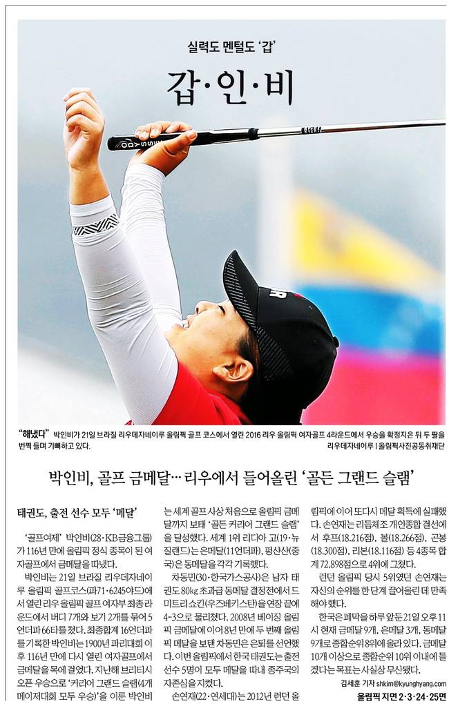 경향신문은 22일자 1면 사진기사로 박은비 선수가 21일 브라질 리우데자네이루 올림픽 골프 코스에서 열린 2016리우 올림픽 여자골프 4라운드에서 우승을 확정지은 뒤 두 팔을 번쩍 들며 기뻐하는 장면을 담았다.