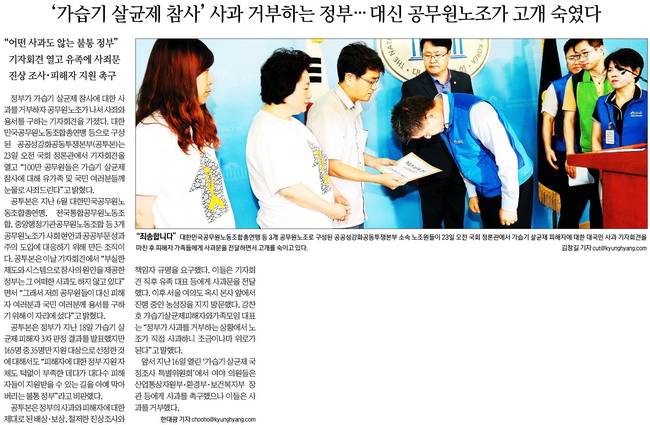 경향신문은 24일자 1면 사진기사에서 대한민국공무원노동조합총연맹 등 3개 공무원 노조로 구성된 공공성강화공동투쟁본부 소속 노조원들이 23일 오전 국회 정론관에서 가습기 살균제 피해자에 대한 대국민 사과 기자회견을 마친 후 피해자 가족들에게 사과문을 전달하면서 고개를 숙이고 있는 장면을 실었다.