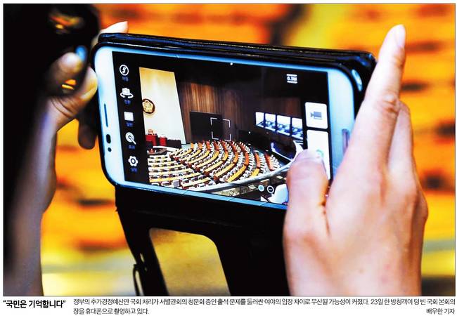 한국일보도 정부의 추가경정예산안 국회 처리가 서별관회의 중인 출석문제를 둘러싼 여야의 입장 차이로 무산될 가능성이 커진 가운데 23일 한 방청객이 텅 빈 국회 본회의장을 휴대폰으로 촬영하는 장면을 실었다.