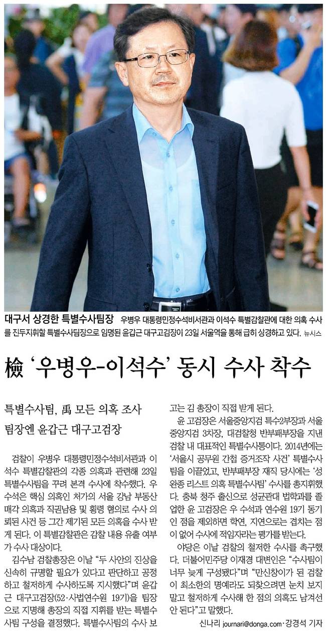 동아일보, 조선일보는 우병우 대통령민정수석비서관과 이석수 특별감찰관에 대한 의혹 수사를 진두지휘할 특별수사팀장으로 임명된 윤갑근 대구고검장이 23일 서울역을 통해 급히 상경한 모습을 전했다.