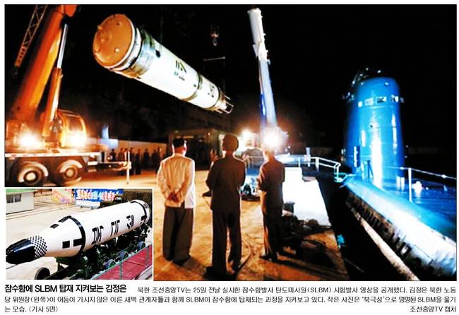 국민일보는 북한 조선중앙TV는 25일 전날 실시한 잠수함발사 탄도미사일(SLBM) 시험발사 영상을 공개한 모습과 김정은 북한 노동당 위원장(왼쪽)이 어둠이 가시지 않은 이른 새벽 관계자들과 함께 SLBM이 잠수함에 탑재되는 과정을 지켜보고 있는 장면을 실었다.